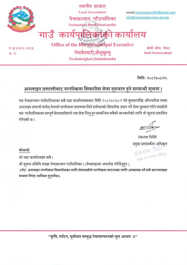 अनलाईन प्रणालीबाट नागरिकता सिफारिस सेवा सुरुवात हुने सम्बन्धी सूचना।