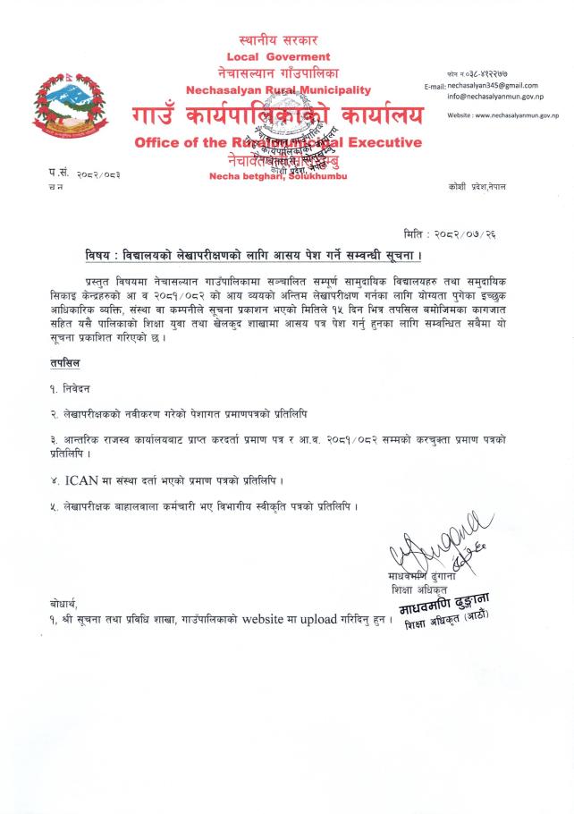 विद्यालयको लेखापरिक्षणको लागि आसय पेश गर्ने सम्बन्धी सूचना ।