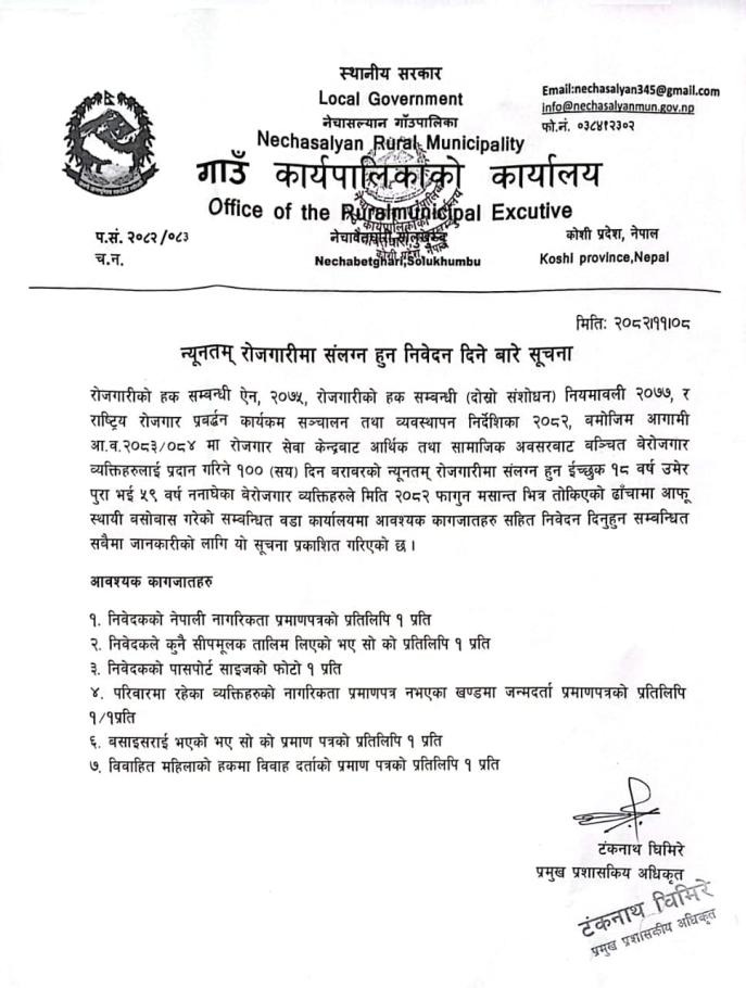 न्यूनतम् रोजगारीमा संलग्न हुन निवेदन दिने सम्बन्धी सूचना।