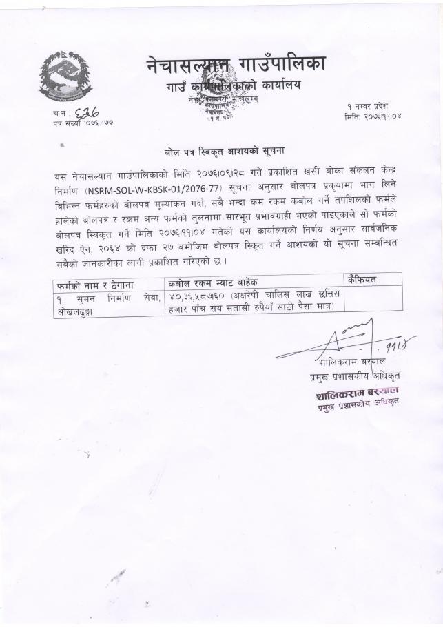 बाेलपत्र स्वीकृत अाशयकाे सुचना