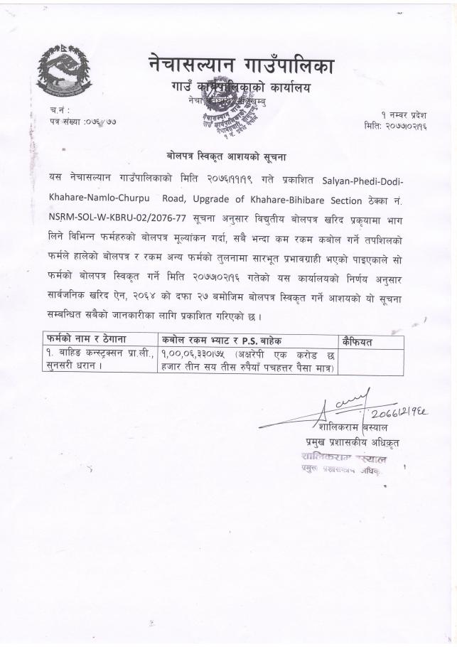 वाेलपत्र स्वीकृत अाशयकाे सुचना ।