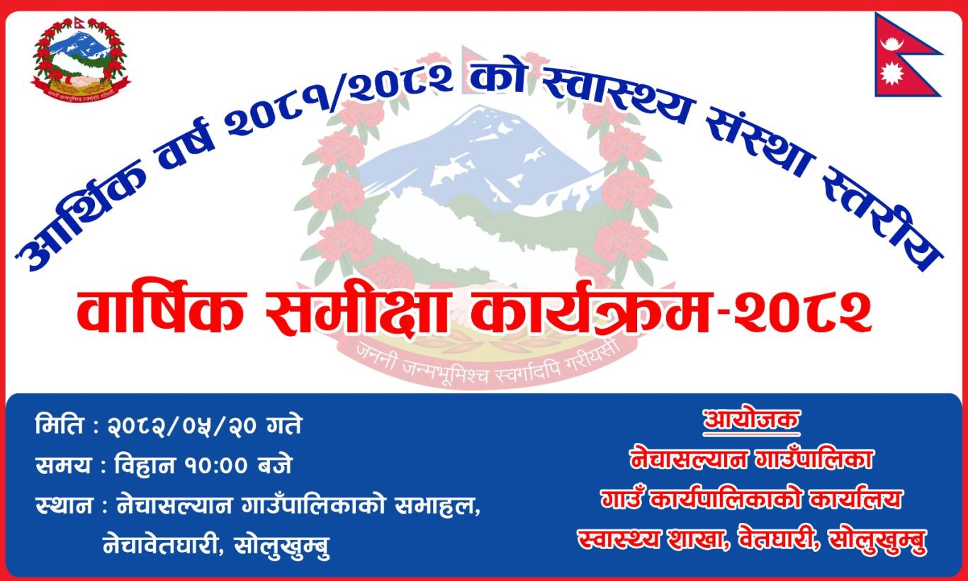 मिति २०८२ साल असार १० गते शुरु भएको नेचासल्यान गाउँपालिका, सोलुखुम्बुको १७ औं गाउँ सभा अधिवेशन सम्पन्न भएको छ। मिति २०८२ साल असार १० गते बसेको सभाको पहिलो बैठकमा छलफलका लागि पेश भएका विधेयकहरुलाई सर्वसम्मतरुपमा पारित गर्दै १७ औं गाउँ सभा अधिवेशन सम्पन्न भएको छ। त्यसैगरी आज मिति २०८२ साल असार ३० गते विहान ११:०० बजेका लागि निर्धारण भएको १७ औं गाउँ सभाको दोस्रो बैठकलाई सभ्य र भव्य रुपमा सम्पन्न गर्न सहयोग पुर्याउनु हुने सरोकारवाला सबैलाई हार्दिक धन्यवाद दिँदै सभाका अध्यक्ष श्री धनजन राईज्यूले १७ औं गाउँ सभा अधिवेशन सम्पन्न भएको जानकारी सभालाई गराउनु भयो।